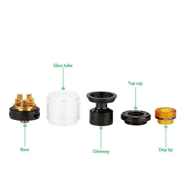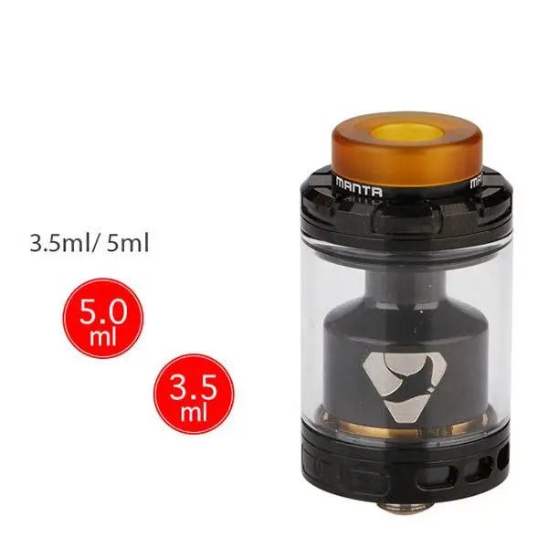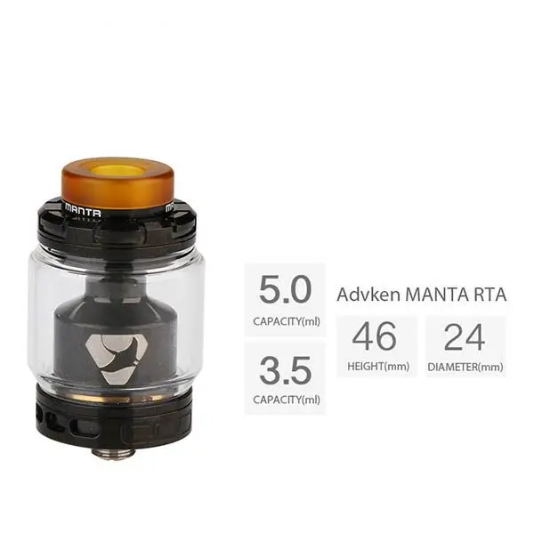 Der Advken Manta RTA Selbstwickler Tank hat einen Durchmesser von 24 mm und je nach verwendetem Tankglas ein Tankvolumen von 5 ml oder 3.5 ml . Das Deck ist ein Dual Coil Deck, welches stark an das Velocity Deck erinnert, die unteren Löcher liegen dabei weiter auseinander als die oberen. Der Manta RTA gehört zu den Geschmackswundern in diesem Segment.Technische Daten