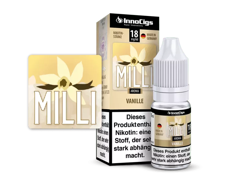 Das Hamburger Unternehmen InnoCigs bietet Ihnen mit dem Milli Liquid ein komplett einsatzfähiges E-Liquid an, welches Sie sofort mit Ihrer E-Zigarette dampfen können. Das Milli Liquid ist für alle zu empfehlen, die den Geschmack von Vanille bevorzugen. Alle Liquids von InnoCigs sind "Made in Germany". Jede Flasche enthält 10ml Liquid in den Nikotinstärken 0mg/ml, 3mg/ml, 6mg/ml, 9mg/ml & 18mg/ml.Inhaltsstoffe für die Stärke: 0mg/ml
