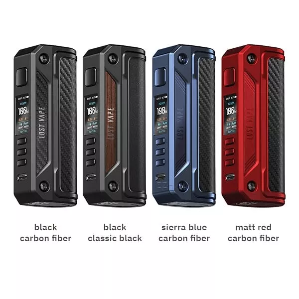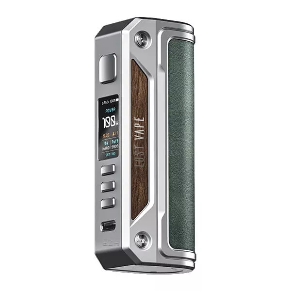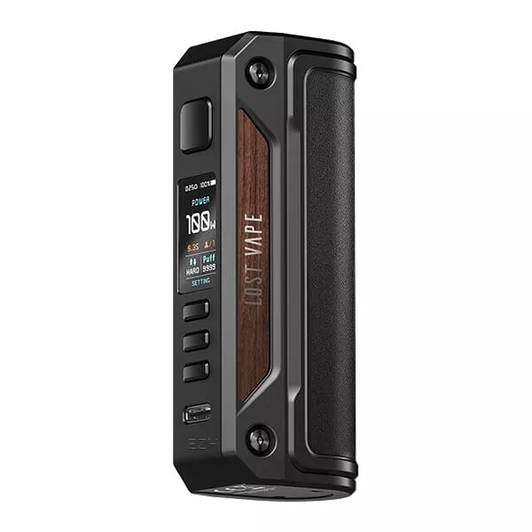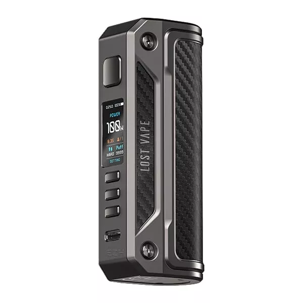 Mit einer Größe von 97.5 x 28.5 x 39.0 mm und einem Leergewicht von 150 g, liegt Lost Vape’s neuer Single-Akku Mod - aus einer hochwertigen Zink-Legierung - kompakt und angenehm leicht in der Hand. Sein Design ist sportlich-modern bei einer sehr ergonomischen Formgebung, die eine komfortable Bedienung über den großzügigen Feuertaster und insgesamt gleich 3 Bedientasten (Up / Select / Down) ermöglicht. Mit der griffig gestalteten Akkufachabdeckung in Carbon oder Soft-Leder Optik, welche sich über die gesamte Rückseite und die Seiten des Mods erstreckt, liegt der Thelema Solo 100W Box Mod zudem auch absolut sicher in des Dampfer‘s Hand. Sie lässt sich auf Wunsch auch gegen eine andere Abdeckung aus dem Zubehör-Angebot austauschen. Ein Eyecatcher ist das brillante 0.96 Zoll TFT Farb-Display, das alle relevanten Informationen übersichtlich und gestochen scharf darstellt und 6 verschiedene Farbschemen zu bieten hat. Auf dem gefederten und vergoldeten 510er-Abschluss des Thelema Solo finden auch größere Verdampfer, bis zu einem Base-Durchmesser von 28mm, bequem Platz.Angetrieben wird der leistungsstarke Box Mod von einer 21700er oder 18650er Akkuzelle (beide nicht im Lieferumfang enthalten), die hinter der magnetischen Akkufachabdeckung einen sicheren Platz findet und über den USB Typ-C Anschluss mit bis zu 2 A Ladestrom auch intern zügig wieder aufgeladen werden kann. Der moderne Quest 2.0 Chipsatz sorgt für eine Spitzen-Performance mit schneller Feuergeschwindigkeit. Er stattet den Thelema Solo 100W Mod neben einem klassischen VW/Power-, VV- und Bypass-Mode auch mit verschiedenen TC-Modi für Edelstahl, Nickel und Titan aus. Die Leistungsausgabe liegt bei maximal 100 W (mit einer 21700er Akkuzelle) und der Temperaturbereich im TC-Modus beträgt 200 bis 600°F bzw. 100 bis 315°C. Zudem ermöglichen 3 unterschiedliche Preheat-Stufen im VW/Power-Modus eine noch individuellere Gestaltung des Dampferlebnisses und es sind drei Speicherplätze für individuelle User-Profile sowie ein Puff-Counter mit an Bord des schicken Box Mods. Für eine stets sichere und zuverlässige Funktion sorgen umfangreiche Schutzschaltungen.