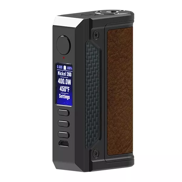 Der Therion 2 DNA 250C Box-Mod besticht durch seine elegante Außenhaut aus einer robusten Zink-Legierung, unterbrochen von sportlich wirkenden Carbon-Panels. Ergänzt wird dies durch eine magnetische Akkufachabdeckung, die mit griffigem Soft-Leder bezogen ist und dem Gerät eine angenehme Haptik verleiht. Der Mod mit den Maßen 91.0 x 26.0 x 54.0 mm liegt sicher in der Hand und bietet Platz für Verdampfer bis zu einem Durchmesser von 25.0 mm auf seinem gefederten 510er Anschluss.Leistung und Akku