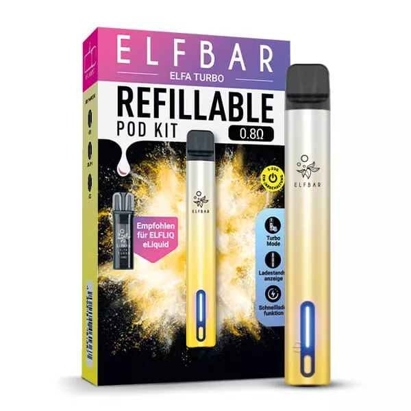 Das Elfa Turbo Refillable Pod Kit von Elfbar ist ein schlankes und leichtes Pod-System, das sich durch sein modernes Pen-Design und seine einfache Handhabung auszeichnet. Mit einem integrierten 550 mAh Akku und zwei wählbaren Leistungsstufen liefert es ein intensives Mund-zu-Lunge (MTL) Dampferlebnis. Der multifunktionale LED Strip informiert über Akkustand und Betriebsmodi, während die automatische Leistungsregulierung eine optimale Anpassung an den eingesetzten Pod gewährleistet. Der Vape Pen ist kompatibel mit nachfüllbaren Elfa Pods und vorgefüllten Pods der Elfa und Tappo Familie, was eine große Geschmacksvielfalt garantiert. Mit schnellem USB Typ-C Charging und sicherer 3-Zug An-/Abschaltung ist das Elfa Turbo Kit ein zuverlässiger Begleiter für unterwegs.Leichte Handhabung für Einsteiger