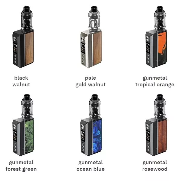 Mit der Kombination aus dem Drag 4 Mod und dem Uforce-L Tank präsentiert VooPoo ein Kit für höchstes DL und auch RDL Dampfvergnügen. Der imposante Drag 4 Mod begeistert mit dem modernen und auch eleganten Design der Drag-Reihe sowie einer tollen Ergonomie mit griffiger Soft-Leder Rückseite. Die magnetische Akkufachabdeckung ist mit Seitenteilen in Holz- oder Resin-Optik verziert, wodurch der Mod einen besonderen Look erhält. Sein massiver 510er-Anschluss kann Verdampfer bis 23 mm ohne Überhang aufnehmen und in mehreren Farbvarianten ist der Drag 4 definitiv ein Hingucker. Der neue Uforce-L Tank passt mit einem Gesamtdurchmesser von 25.5 mm einfach perfekt zum kraftvollen Box-Mod und zieht mit seinem ebenfalls sehr modernen Design die Blicke auf sich. Mit dieser beeindruckenden Kombi haben DL und RDL Dampfer ein leistungsstarkes Kit in der Hand, das durch seine hochwertige Verarbeitung, seine komfortable Bedienung und vor allem durch seine geschmacks- und dampfstarke Performance restlos begeistert.Angetrieben von zwei 18650er Akkuzellen (nicht enthalten) liefert der Drag 4 Mod eine variable Ausgangsleistung von bis zu 177 Watt und bietet dabei insgesamt vier Dampfmodi. Der SMART-Modus erkennt den Coilwiderstand, stimmt die Leistung automatisch optimal auf diesen hin ab und legt eine Leistungsobergrenze zum Schutz der Coil fest. Der RBA-Modus hingegen lässt dem Dampfer freie Hand bei der Leistungseinstellung. Ein ECO-Modus sorgt für energieeffizientes Dampfen und TC-Modi für Ni, Ti und SS werden Fans des temperaturgeregelten Dampfens erfreuen. Die modernste GENE Chip Version garantiert eine absolute Top-Performance sowie ein stets sicheres Dampferlebnis und über den USB Typ-C Anschluss sind ein Fast-Charging der Akkuzellen mit bis zu 3A sowie Software-Updates möglich. Die Bedienung erfolgt über den großzügig dimensionierten Feuertaster sowie zwei Up/Down Bedientasten. Ein zusätzlicher Multifunktions-Switch lässt sich individuell mit einer von drei Funktionen (Lock/Unlock Mod, Power On/Off Mod, Lock/Unlock Power) belegen und ermöglicht so die schnelle Nutzung der gewünschten Funktion. Das brillante Farb-Display liefert eine Vielzahl an Informationen und bietet zugleich verschiedene UI-Farbschemen für eine noch individuellere Note.