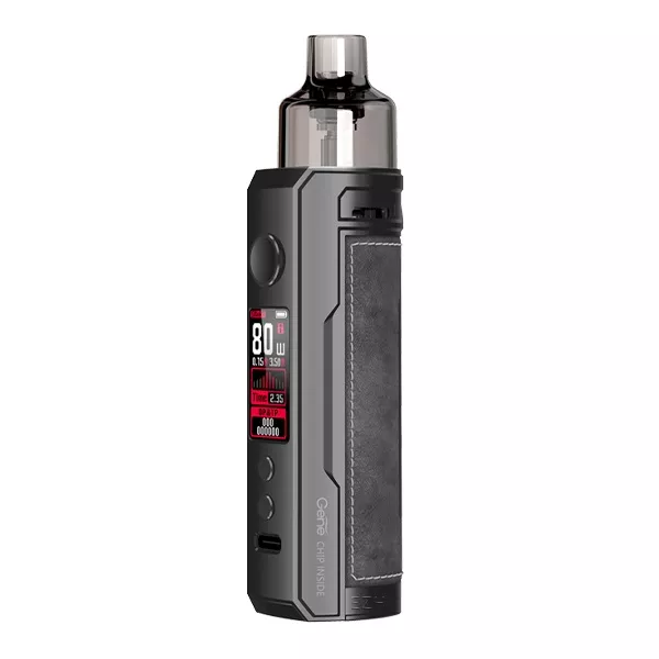 Das Drag X Pod-Kit von Voopoo ist ein ausgewachsenes Pod-Kit bzw. ein All-in-One-Kit mit einstellbarer Leistung und einer austauschbaren 18650er Batterie (nicht im Lieferumfang enthalten). Es ist kompakt in der Größe und misst einschließlich der Pods nur 95 * 28 * 32,5 mm. Die Verarbeitungsqualität und die verwendeten Materialien (Aluminium und Leder) sind großartig, so dass sowohl eine edle Optik, eine tolle Haptik als auch eine tolle Ergonomie entsteht. Der eingebaute Gene.TT-Chip reagiert sehr schnell und zuverlässig, liefert bis zu 80 Watt und unterstützt auch die interne Aufladung des Akkus über USB-Type C-Kabel mit bis zu 2A. Alle relevanten Schutzschaltungen sind an Bord und die Handhabung ist mit Unterstützung eines großen Displays sehr einfach. Die PCTG-Pods fassen bis zu 4,5 ml Flüssigkeit und können von unten befüllt werden. Auch das Reinigen oder Wechseln der fertigen Coils ist sehr einfach. Zum Lieferumfang gehören zwei fertige Coils (PnP VM6 mit 0,15 Ohm und PnP VM1 mit 0,3 Ohm), die für einen offenen und direkten Zug ausgelegt sind, aber alle fertigen Coils und die Selbstwickeleinheit (RBA) der PnP-Serie passen, so dass wirklich keine Wünsche offen bleiben sollten. Von MTL, über restriktives DL bis hin zu offenem DL ist alles möglich, was das Dampferherz begehrt. Dank einer sehr gut einstellbaren Airflowcontrol können Sie das Zugverhalten immer perfekt auf Ihre eigenen Bedürfnisse abstimmen.