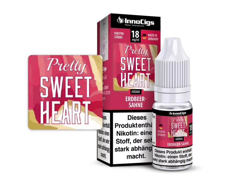 Von der Liquidschmiede InnoCigs, welches in Deutschland produziert und herstellt, stammt das Pretty Sweetheart Liquid. Bei der Herstellung wurde auf eine stets gleichbleibende Dampf- bzw. Geschmacksentwicklung geachtet, unabhängig von der verwendeten E-Zigarette. Dieses Liquid setzt beim Dampfen mit der von Ihnen verwendeten E-Zigarette den Geschmack von Erdbeeren und Sahne frei. Jede Flasche enthält 10ml Liquid in Ihrer gewählten Stärke.