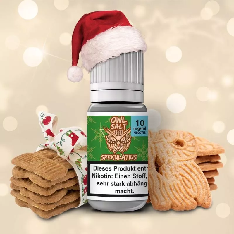 Erleben Sie mit dem Owl Salt Spekulatius E-Liquid die weihnachtliche Magie von Spekulatius in Ihrem Dampferlebnis. Dieses Liquid fängt den festlichen Geschmack von Spekulatius ein, angereichert mit süßen, würzigen Noten und einem Hauch von traditionellen Weihnachtsgewürzen. Das Ergebnis ist ein cremiges Dampferlebnis, das an hausgemachte Spekulatiusplätzchen erinnert und sich perfekt für die festliche Jahreszeit eignet. Speziell für die Verwendung in Podsystemen wie Oxva, Lost Vape und Uwell Caliburn entwickelt, gewährleistet es ein sanftes und genussvolles Dampferlebnis. Verfügbar in verschiedenen Nikotinstärken (0/10/20 mg), können Sie das festliche Aroma von Spekulatius ganz nach Ihren persönlichen Vorlieben genießen. Hergestellt in Deutschland, steht das Owl Salt Spekulatius E-Liquid für höchste Qualität und Sicherheit und erfüllt alle relevanten Standards. Dank der handlichen 10-ml-Flasche ist das Liquid leicht zu handhaben und bequem nachzufüllen, ideal für den Genuss unterwegs.Nikotinsalz Liquids