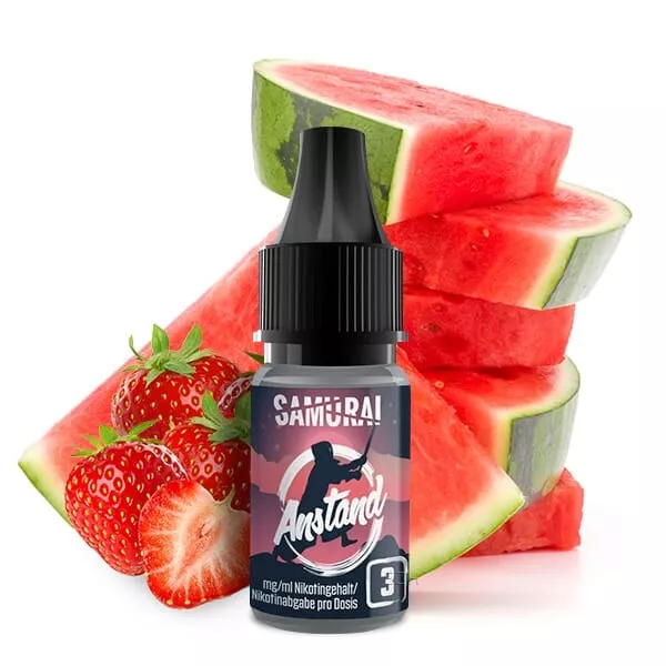 Anstand ist eine Tugend, die jeder gute Samurai besitzen sollte und Samurai Vaping widmen dieser Tugend gleich ein ganzes Aroma. Hierbei bringen sie Dir mit Anstand einen absoluten Sommermix in den Tag Deiner E-Zigarette, der Dein Geschmackszentrum im Sturm erobern wird. In Anstand treffen reife und saftige, aromatisch-süße Erdbeeren auf die verführerisch süße und erfrischend saftige Wassermelone. Das Zusammentreffen dieser zwei typischen Sommerfrüchte gipfelt mit Anstand in einer sommerlichen Geschmacksexplosion, die alle Fruchtliebhaber und Fans der beiden süßen Früchtchen vollauf begeistern wird. So verleihen die Erdbeeren dem Aroma ihre charakteristische Süße, während die Wassermelone ihm, neben ihrer Süße, noch eine gewisse Leichtigkeit und einen erfrischenden Charakter gibt. So, lässt man sich wohl gerne Anstand beibringen!10ml Fertig-Liquids