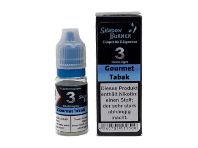 Die Shadow Burner Liquids werden in Deutschland entwickelt und hergestellt. Pro bestellter Flasche erhalten Sie insgesamt 10 ml des Shadow Burner Liquids namens Gourmet Tabak. Das Liquid ist für das pure Dampfen in E-Zigaretten geeignet und in den Nikotinstärken 3 mg/ml und 6 mg/ml erhältlich. Die Geschmacksrichtung Gourmet Tabak schmeckt beim Verdampfen nach Tabak mit einem Hauch von Nuss, Vanille und Apfel.10ml Fertig-Liquids