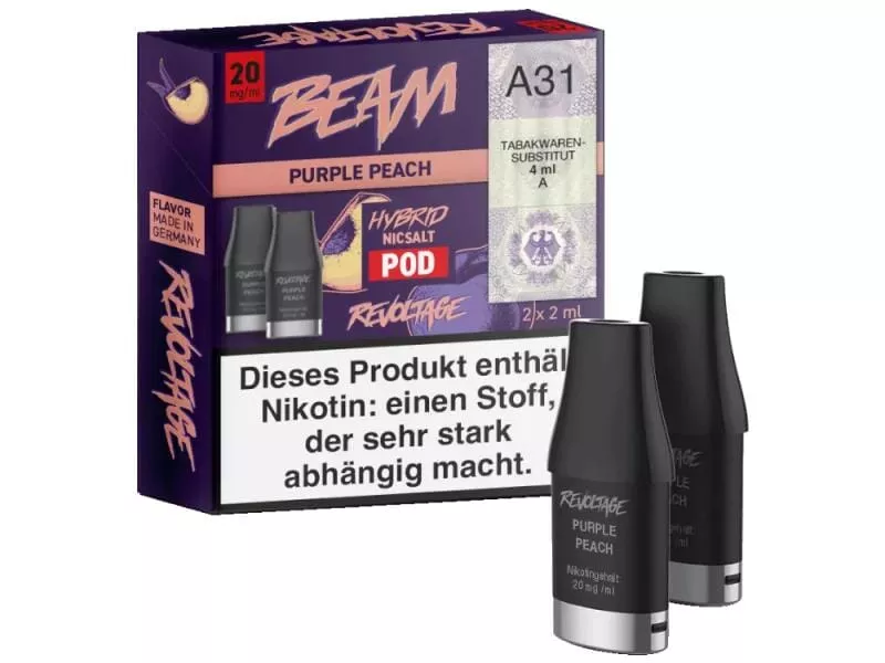 Entdecken Sie die exzellente Qualität und Geschmacksvielfalt der Beam Pods von Revoltage, optimal abgestimmt auf den 500 mAh Revoltage Beam Akku. In jedem Pod stecken 2 ml fein abgestimmtes Liquid, wählbar in den Nikotinstärken 10 mg/ml, 20 mg/ml oder in einer komplett nikotinfreien Ausführung. Die Sorte "Purple Peach" überzeugt mit dem saftig-süßen Geschmack von reifen Pfirsichen, der von einer eiskalten Frische umhüllt wird. Wie ein Pfirsich, direkt aus dem eisigen Kühlfach, verschafft "Purple Peach" Ihnen ein frostig-fruchtiges Dampferlebnis, das Ihre Sinne erfrischt und belebt. Gönnen Sie sich diesen kühlen Pfirsichgenuss und lassen Sie sich von "Purple Peach" in sommerliche Gefilde entführen.Technische Daten